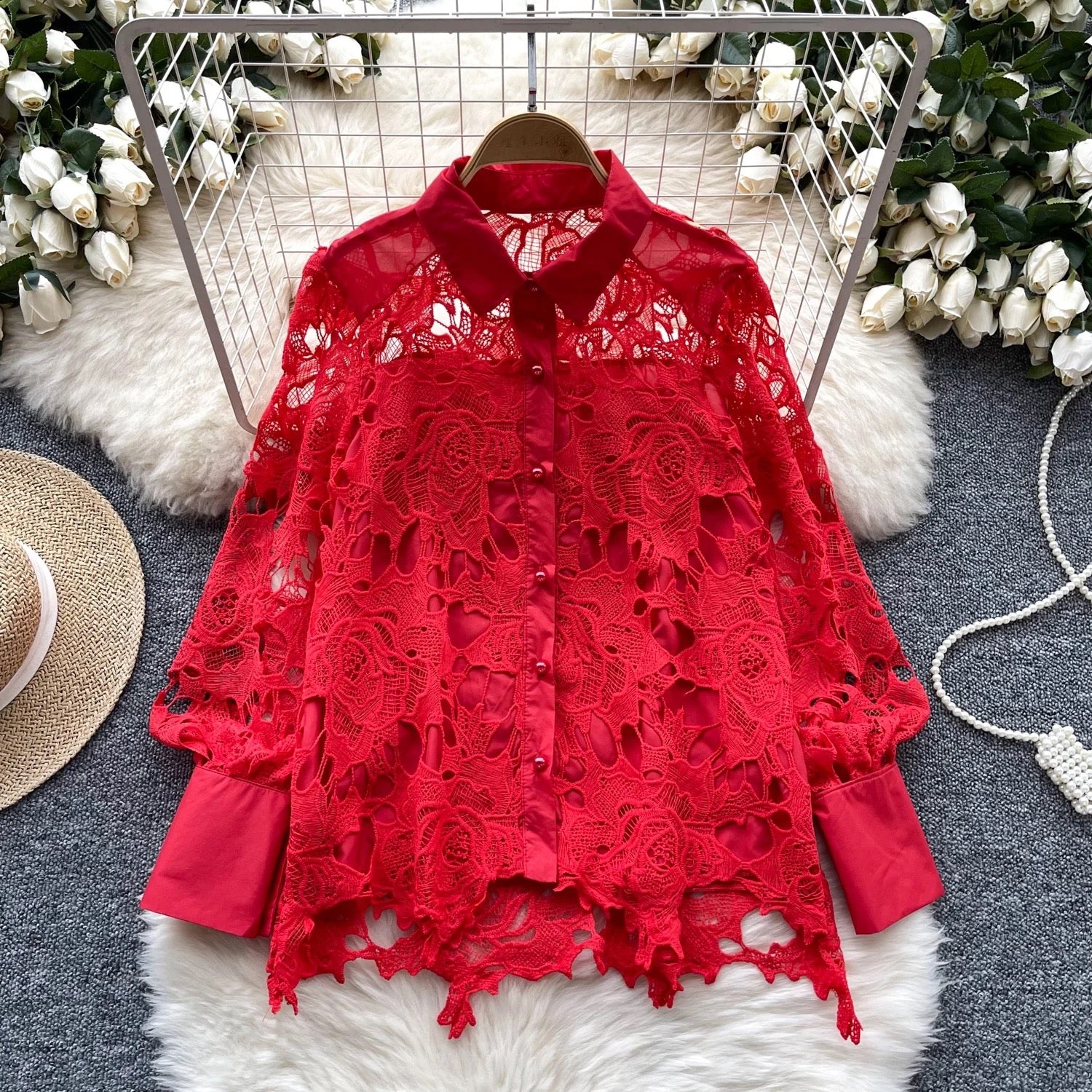 Step into elegance with the Rose Lattice Lace Shirt! Designed with exquisite rose-patterned lace, this button-down shirt combines timeless sophistication with a modern edge. The semi-sheer design, structured cuffs, and tailored collar create a striking balance of bold and feminine. Available in Red, Black, Ivory, and Blush Pink, this piece is perfect for adding flair to evening wear or upgrading your everyday style. Make every moment chic!