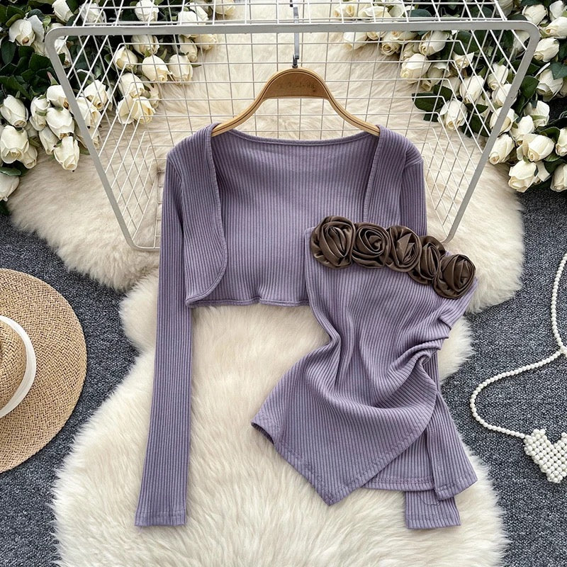 Step up your style game with the Rose Ribbed Top with shrug. Featuring a flattering ribbed texture, a chic wrap design, and stunning 3D rosette embellishments across the bust, this top is a head-turner. Its long sleeves and cropped fit add a modern, versatile edge. Available in Lavender, Grey, Black, and Cream, it’s perfect for brunch dates, casual outings, or pairing with high-waisted jeans for a trendy look. Bloom with confidence!